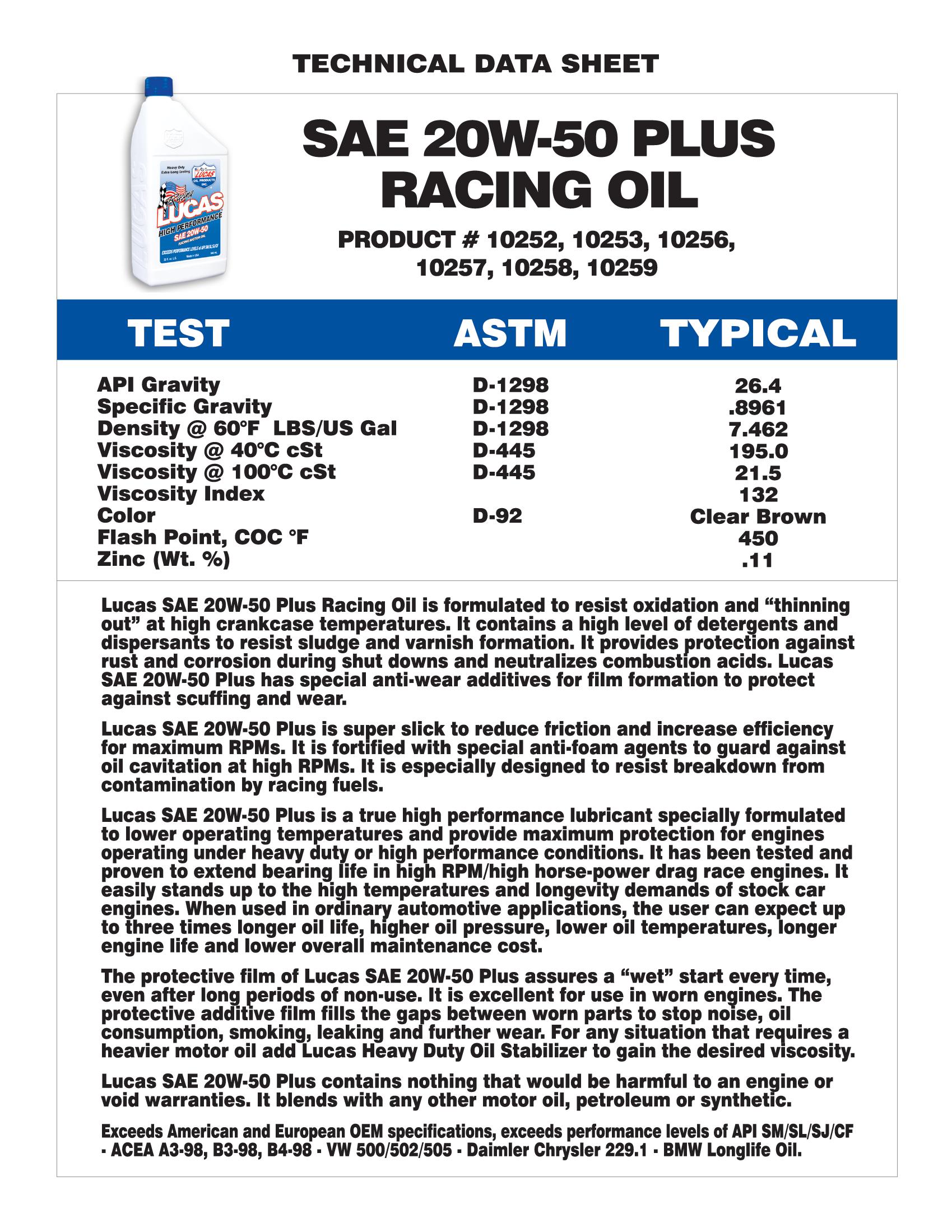 Lucas 20W-50 Plus High Performance Oil – The “PLUS” is for an extra additive package above and beyond a normal 20W-50 racing oil.