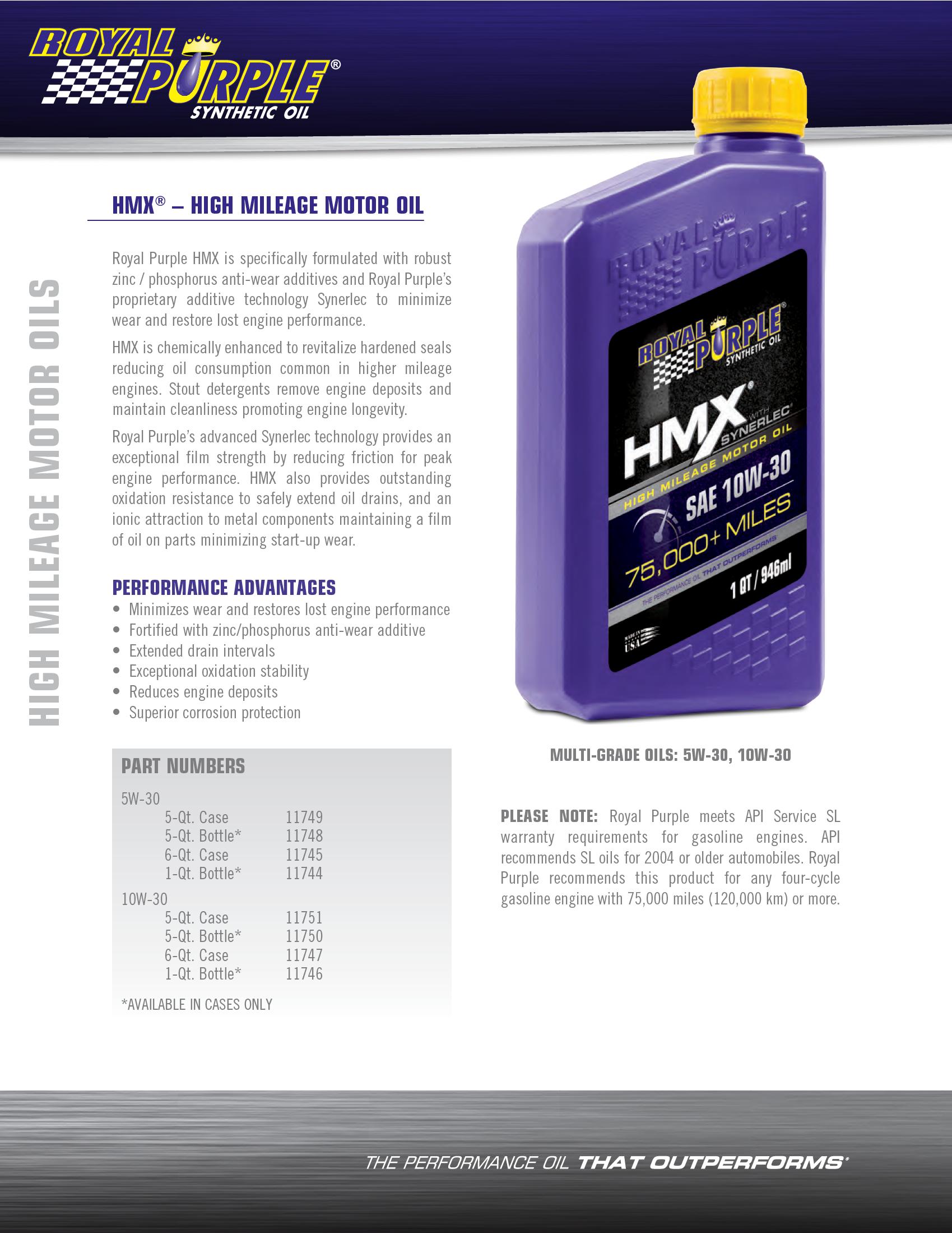 Royal Purple HMX high-mileage motor oil offers outstanding oxidation resistance to safely extend oil drains; plus an ionic attraction to metal components to maintain a film of oil on engine parts, minimizing start-up wear.