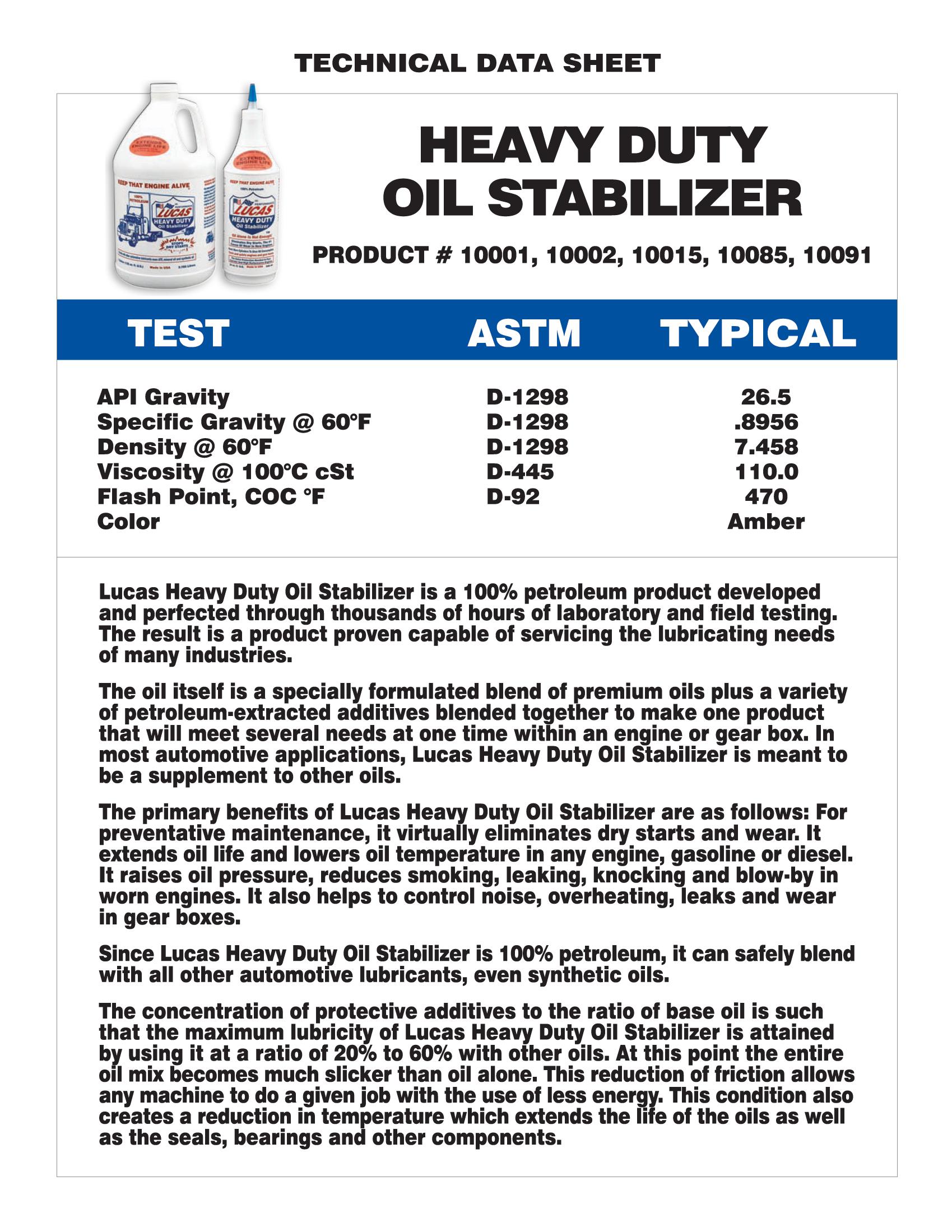 Lucas Oil Stabilizer is a 100% petroleum product formulated to eliminate dry starts and reduce friction, heat and wear in any type of engine. It allows motor oils a higher degree of lubricity which reduces oil consumption and operating temperatures.