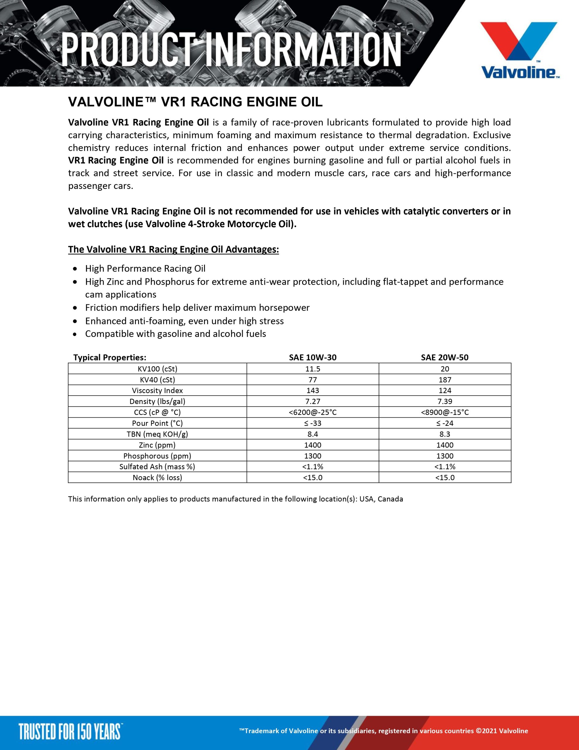 Valvoline VR1 Racing Engine Oil is a family of race-proven lubricants formulated to provide high load carrying characteristics, minimum foaming and maximum resistance to thermal degradation.
