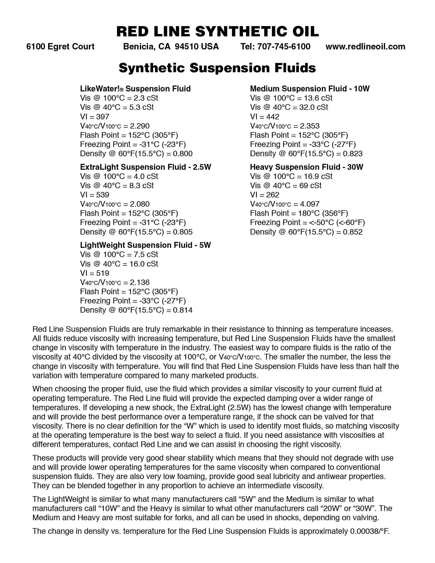 You will find that Red Line Suspension Fluids have less than half the variation with temperature compared to many marketed products.