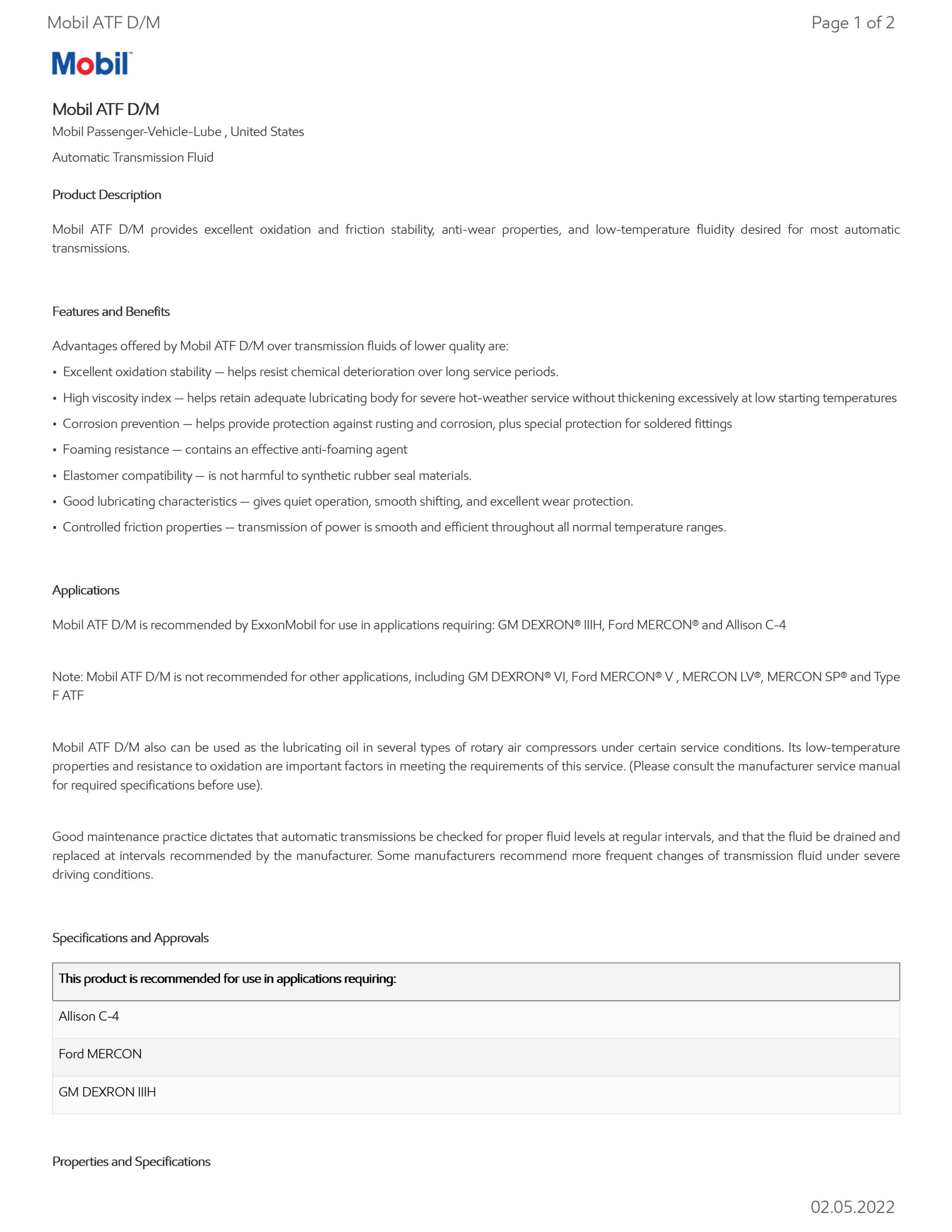 Mobil ATF D/M is recommended by ExxonMobil for use in applications requiring: GM DEXRON® IIIH, Ford MERCON® and Allison C-4.