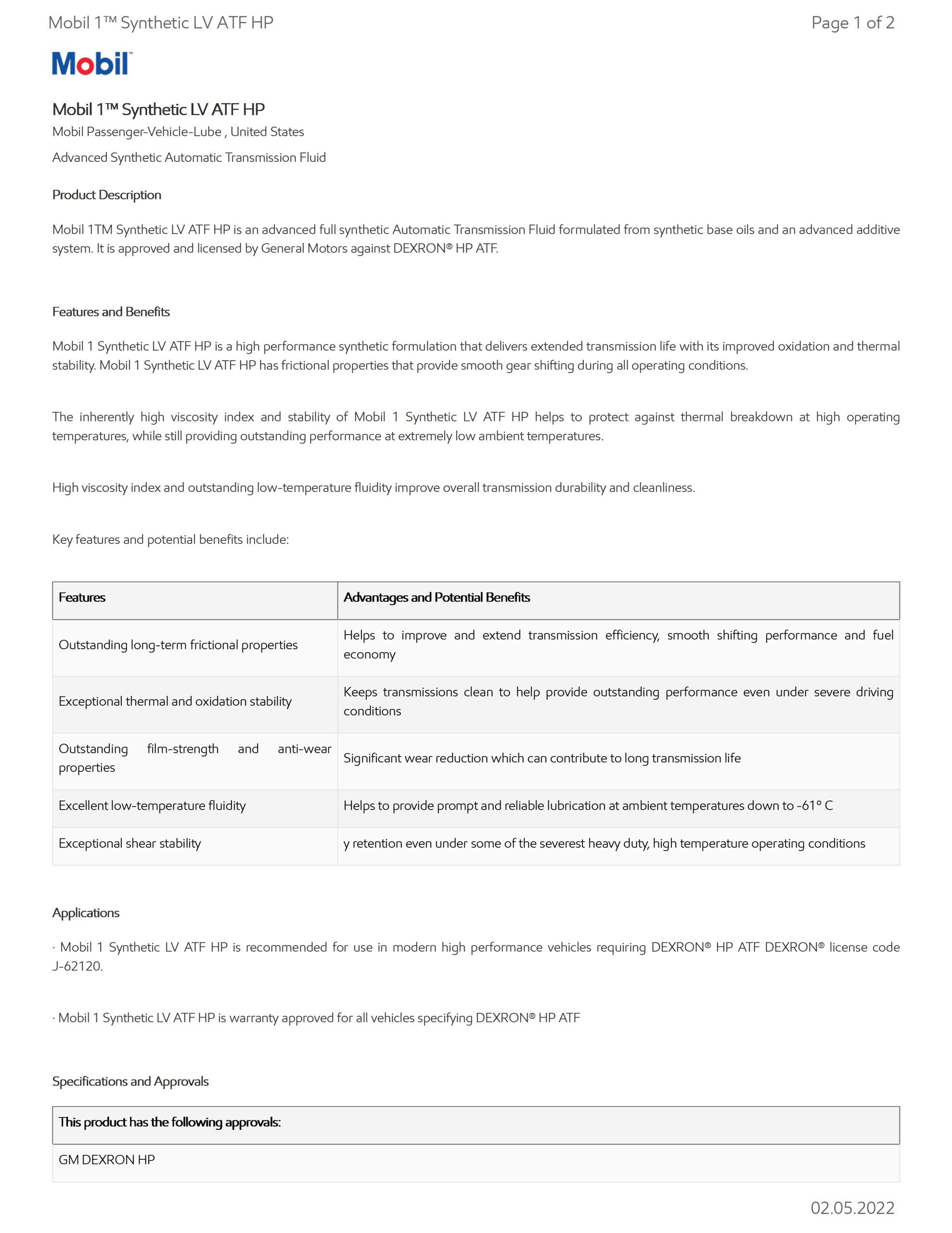Mobil 1™ Synthetic LV ATF HP is an advanced full synthetic Automatic Transmission Fluid formulated from synthetic base oils and an advanced additive system. It is approved and licensed by General Motors against DEXRON® HP ATF.