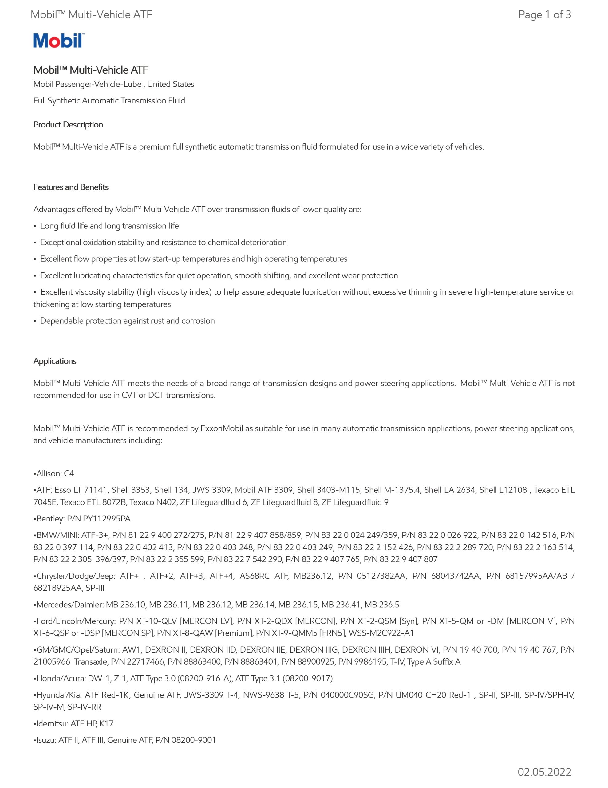 Mobil Multi-Vehicle ATF is recommended by ExxonMobil as suitable for use in many automatic transmission applications, power steering applications, and vehicle manufacturers.