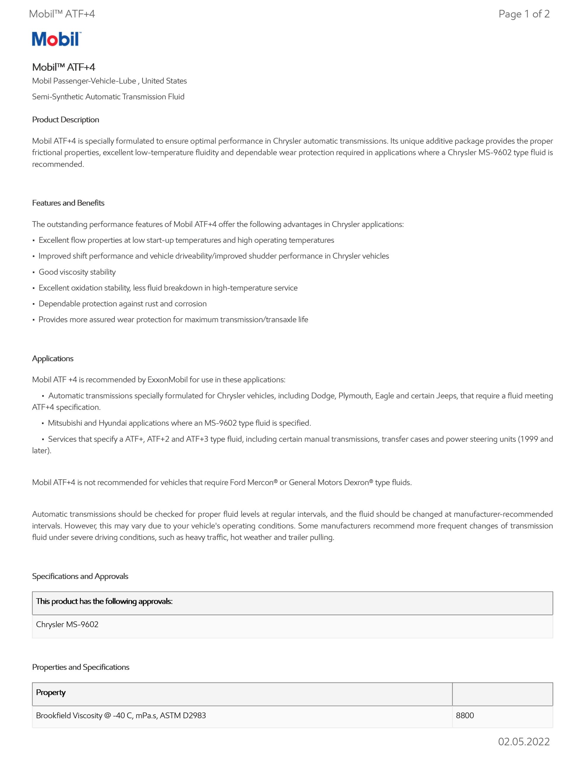 Mobil ATF+4 is specially formulated to ensure optimal performance in Chrysler automatic transmissions. Its unique additive package provides the proper frictional properties, excellent low-temperature fluidity and dependable wear protection required in applications where a Chrysler MS-9602 type fluid is recommended.