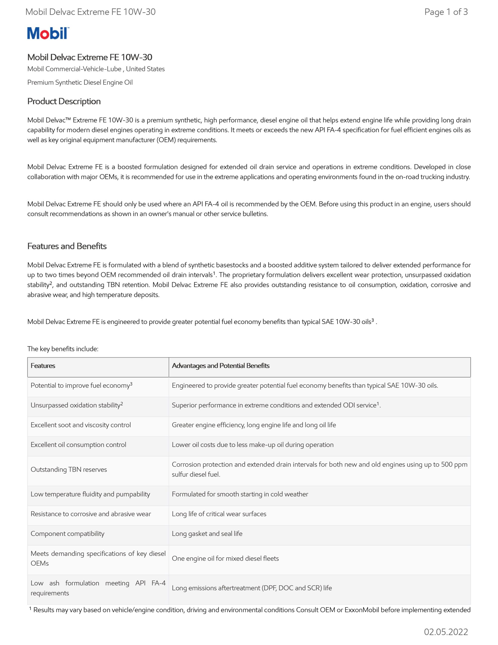 Mobil Delvac Extreme FE should only be used where an API FA-4 oil is recommended by the OEM. Before using this product in an engine, users should consult recommendations as shown in an owner’s manual or other service bulletins.