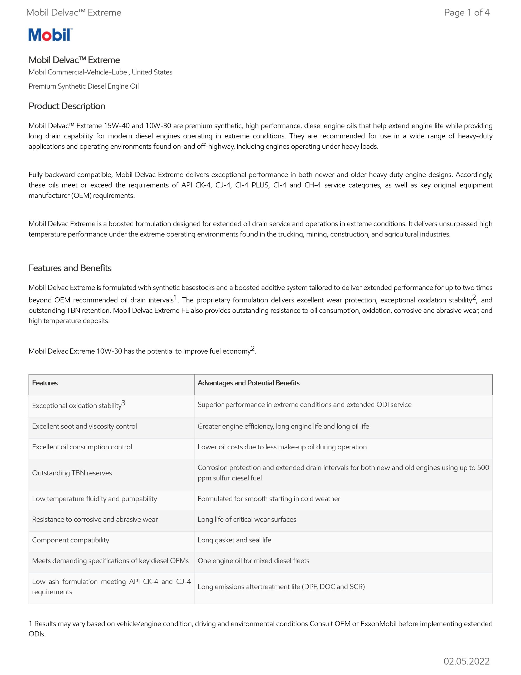 (1) Results may vary based on vehicle/engine condition, driving and environmental conditions Consult OEM or ExxonMobil before implementing extended ODIs.