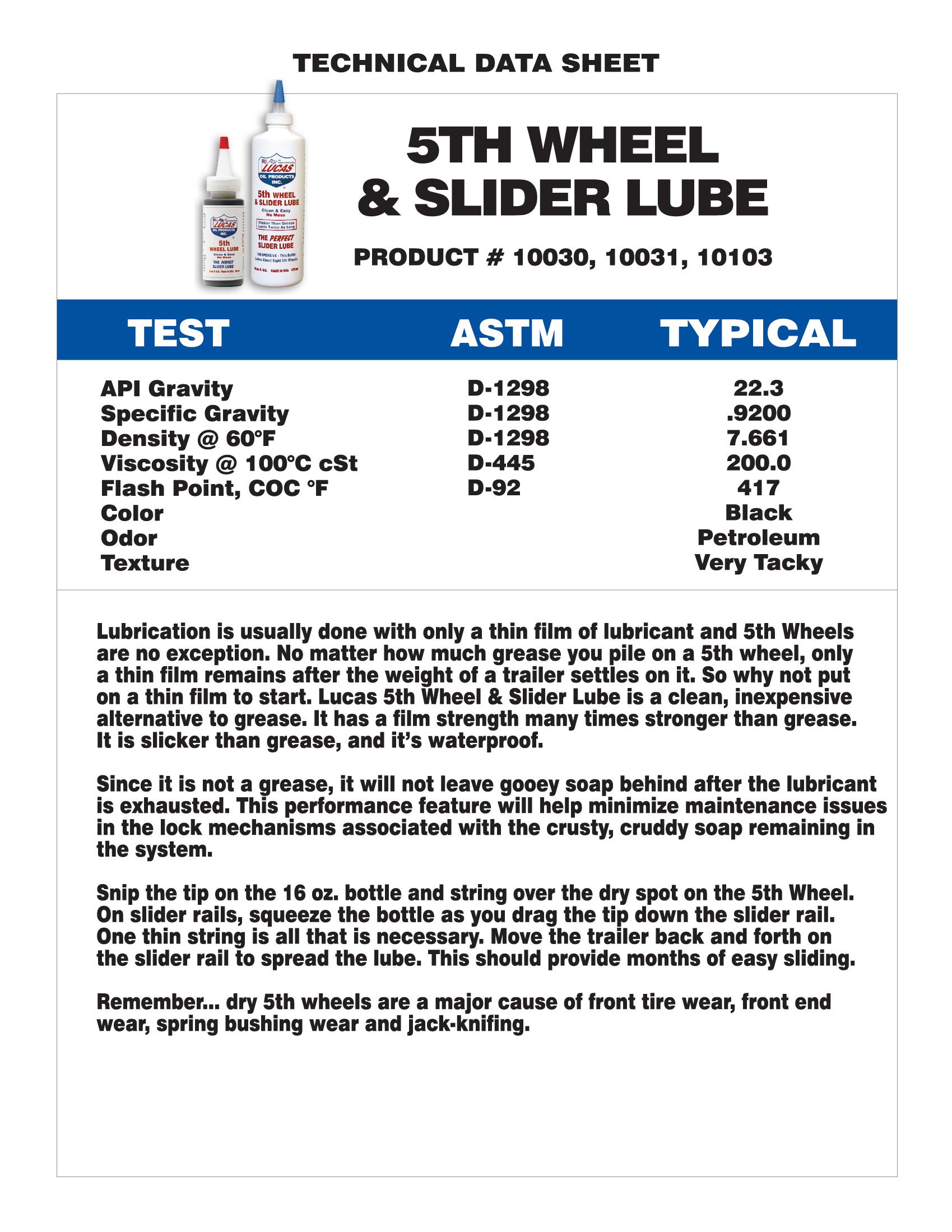 Lucas 5th Wheel and Slider Lube is a clean, inexpensive, easy to use solution to the problem of dry 5th wheels and slider rails. It is virtually waterproof so it won’t wash off slider rails on wet roads.