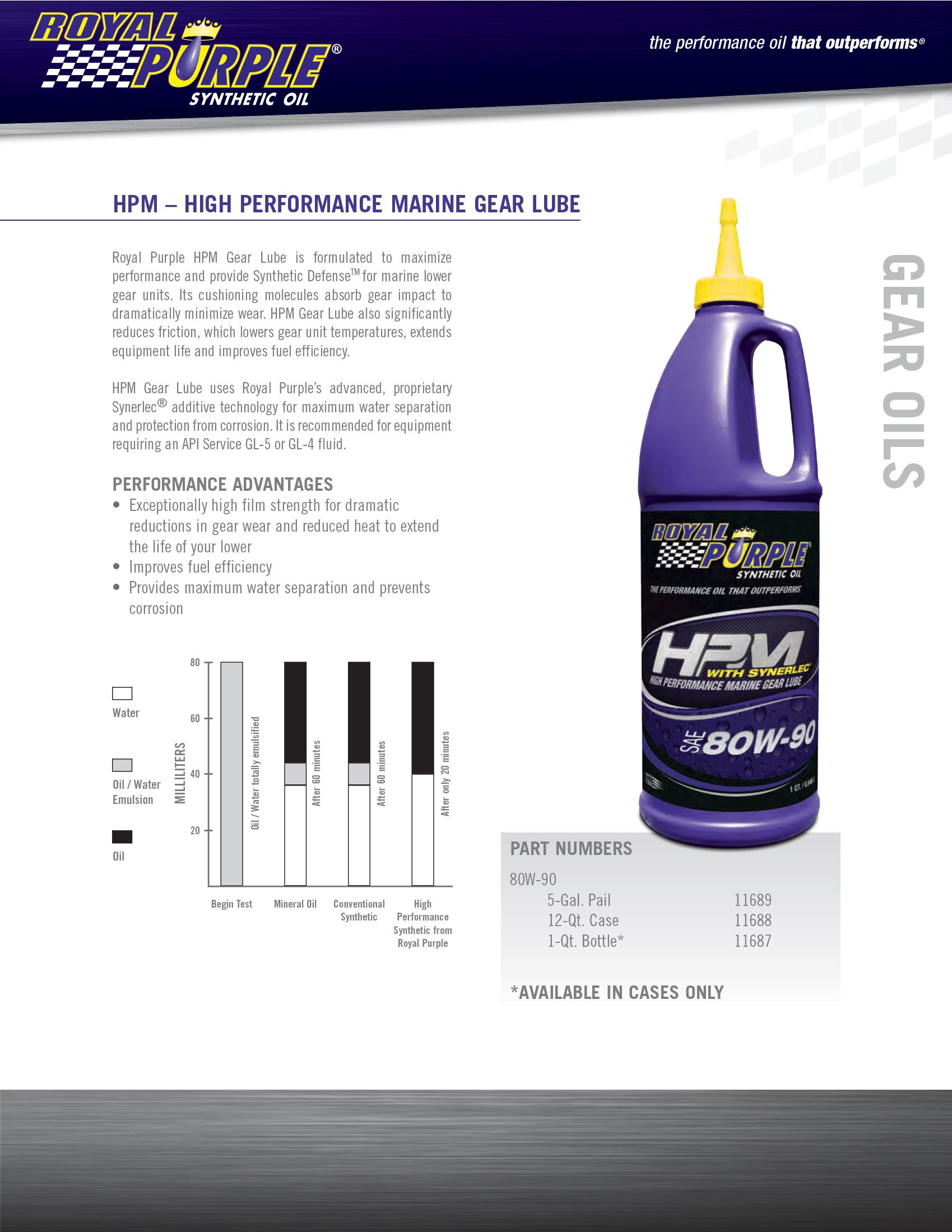 Royal Purple HPM Gear Lube is formulated to maximize performance and provide Synthetic Defense for marine lower gear units.