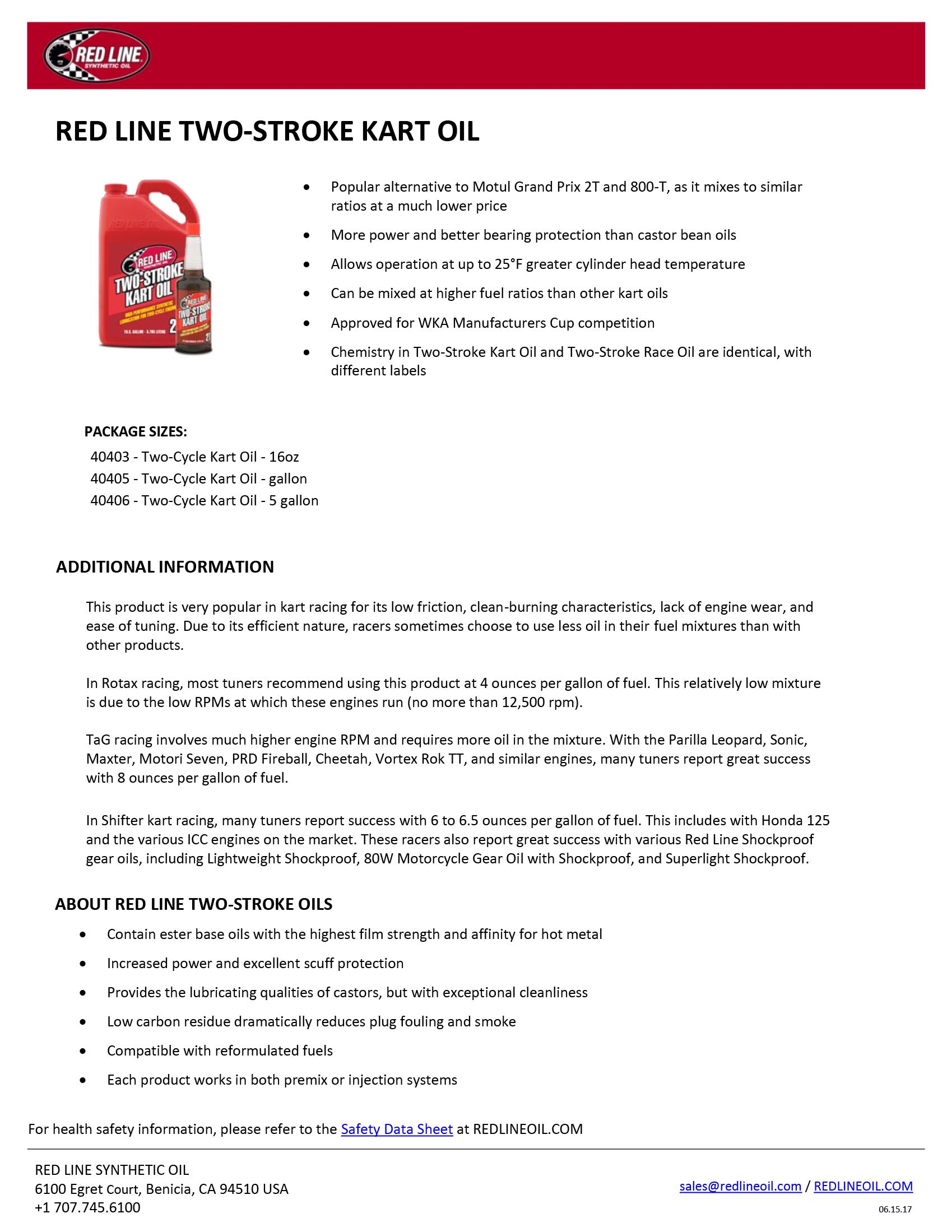Can be mixed at higher fuel ratios than other kart oils.