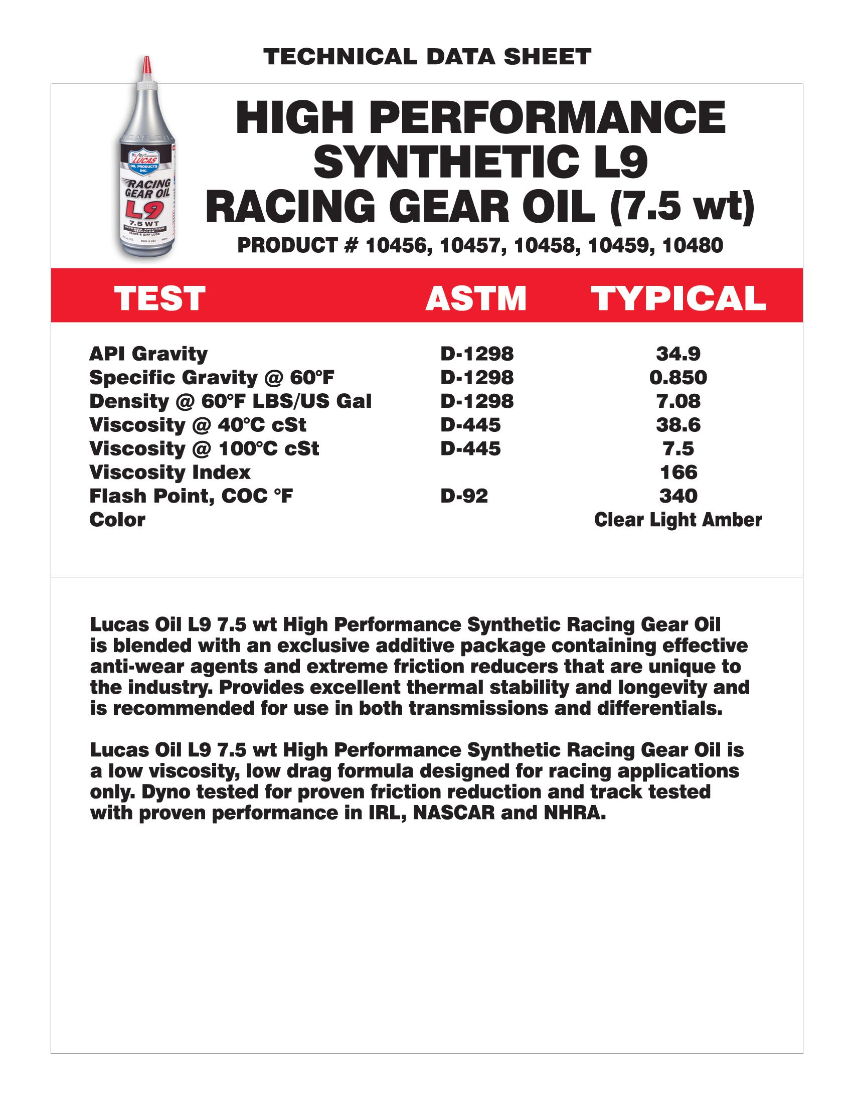 The Lucas L9 Racing Gear Oil provides excellent thermal stability and longevity throughout the entire drive train system.