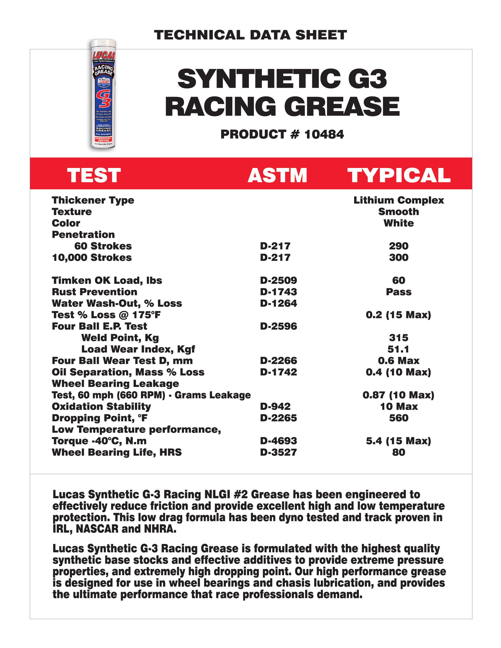 Lucas G3 Racing Grease is a true high temp/low temp friction-free racing grease for qualifying and racing. Extreme friction reducer to minimize drag.
