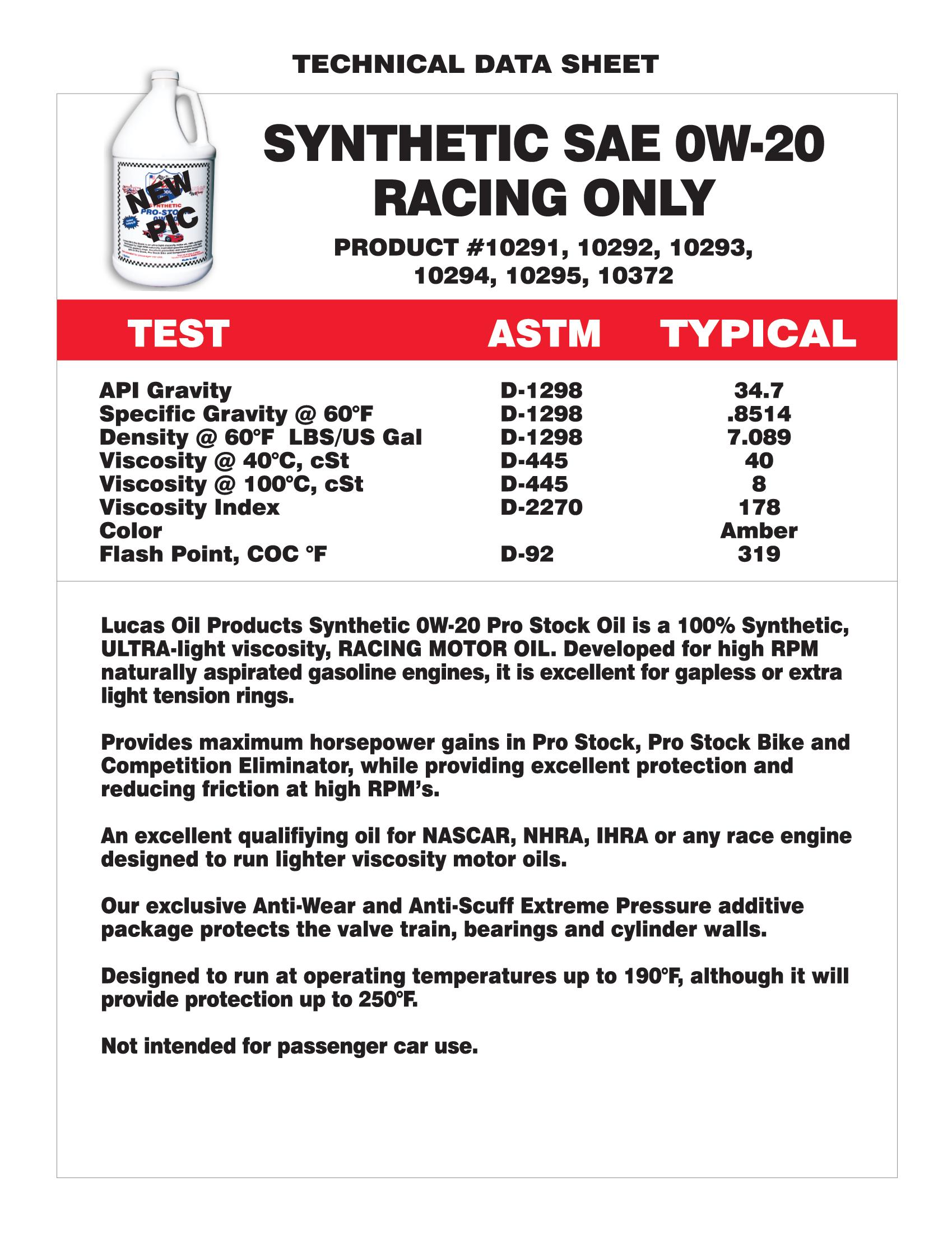 Lucas High Performance Racing Only is a purpose built product designed for the high performance racing industry. It’s blended with an exclusive additive package that includes lubricity agents and anti-seize agents that control drag like a zero weight oil and protects metal like a heavy multi-viscosity oil. It is perfect for high RPM & high horsepower Engines.