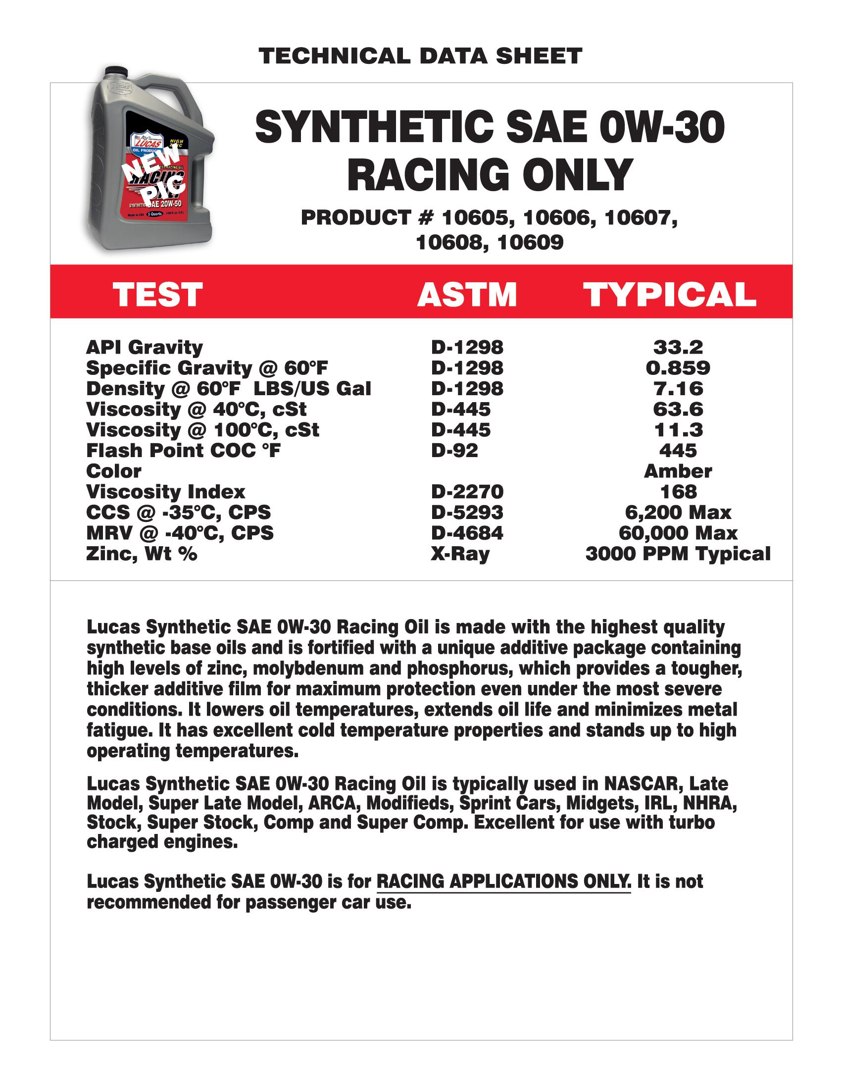 Lucas High Performance Racing Only is a purpose built product designed for the high performance racing industry. It’s blended with an exclusive additive package that includes lubricity agents and anti-seize agents that control drag like a zero weight oil and protects metal like a heavy multi-viscosity oil. It is perfect for high RPM & high horsepower Engines.