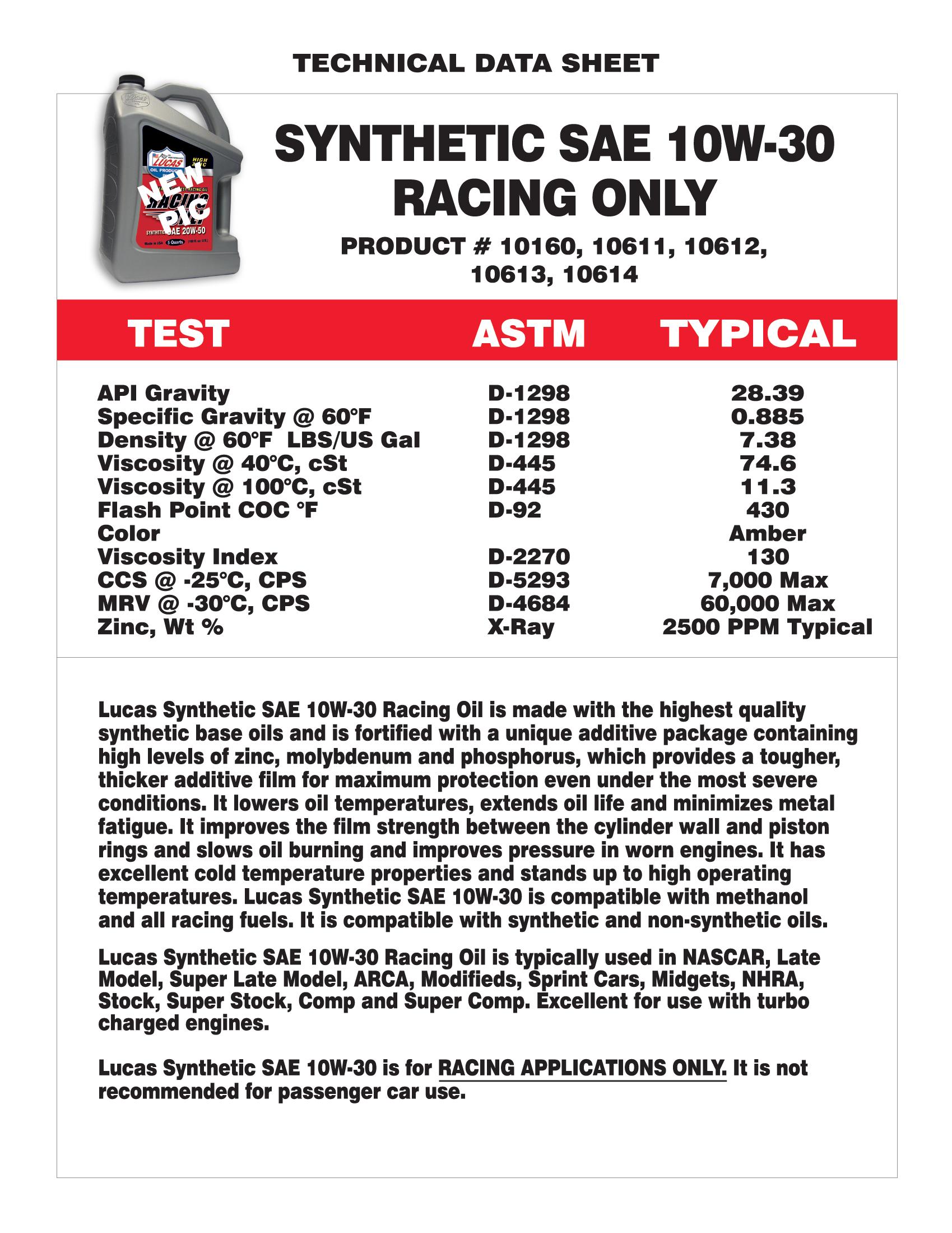 Lucas High Performance Racing Only is a purpose built product designed for the high performance racing industry. It’s blended with an exclusive additive package that includes lubricity agents and anti-seize agents that control drag like a zero weight oil and protects metal like a heavy multi-viscosity oil. It is perfect for high RPM & high horsepower Engines.