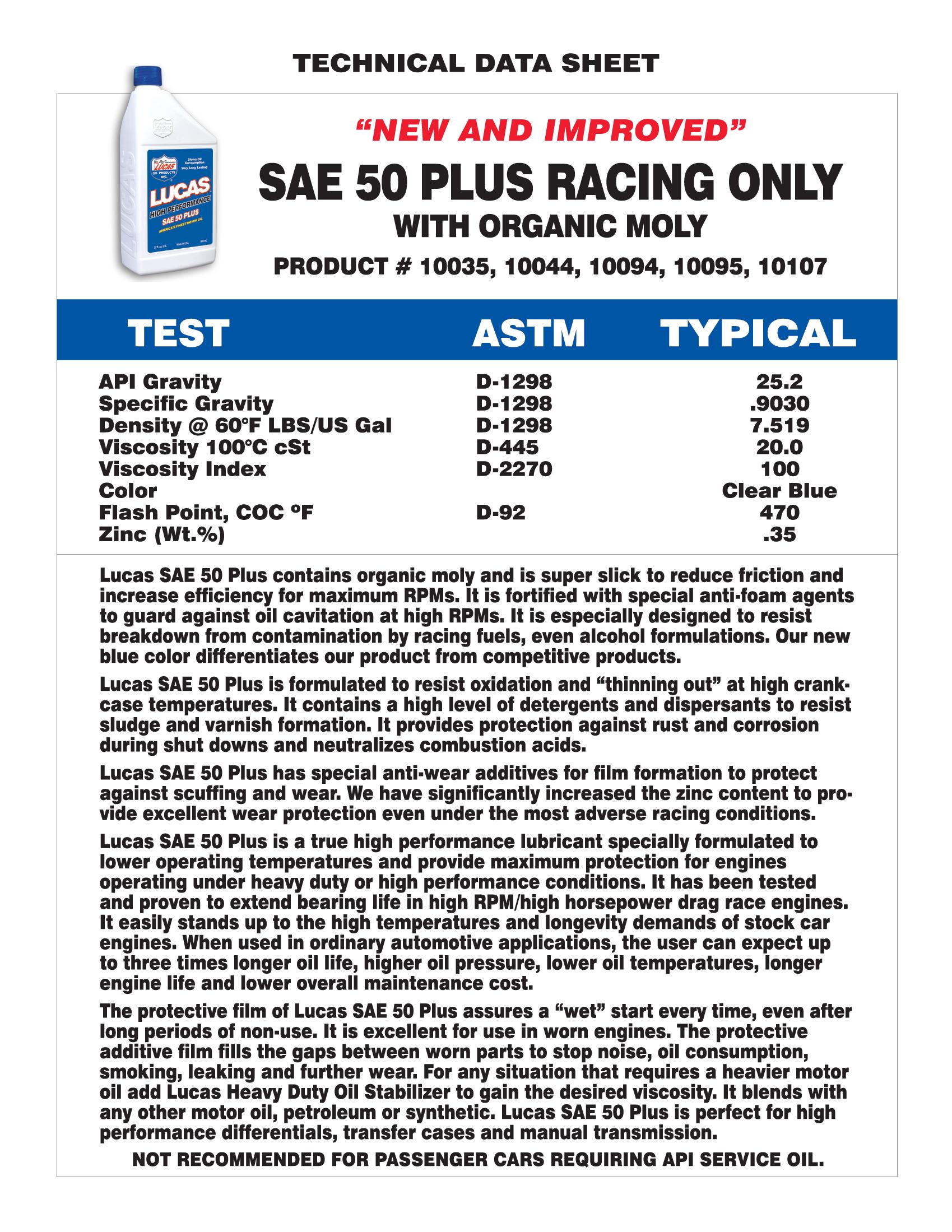 SAE 50WT Plus Racing Oil – The “PLUS” is for the extra additives above and beyond the normal additive package found in ordinary racing oils.