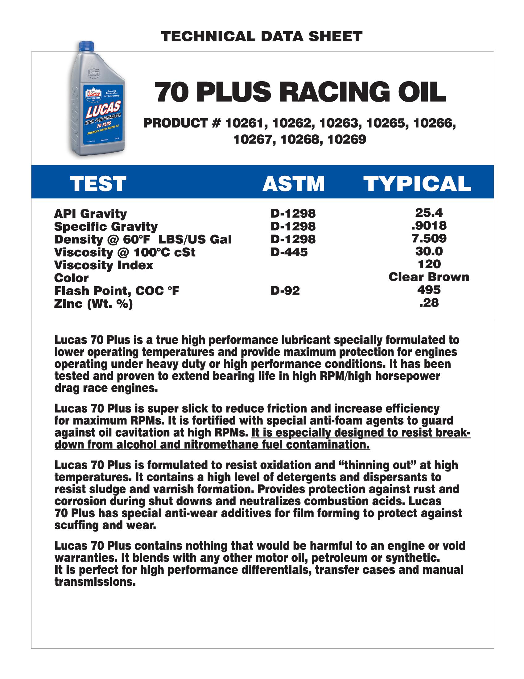 Lucas SAE 70WT Plus Racing Oil – The “PLUS” is for the extra additives above and beyond the normal additive package found in ordinary racing oils. This very excellent product was especially developed to protect top fuel engines. This was tested extensively on the 1996 NHRA circuit and every crew who used it claimed it to the “BEST”.